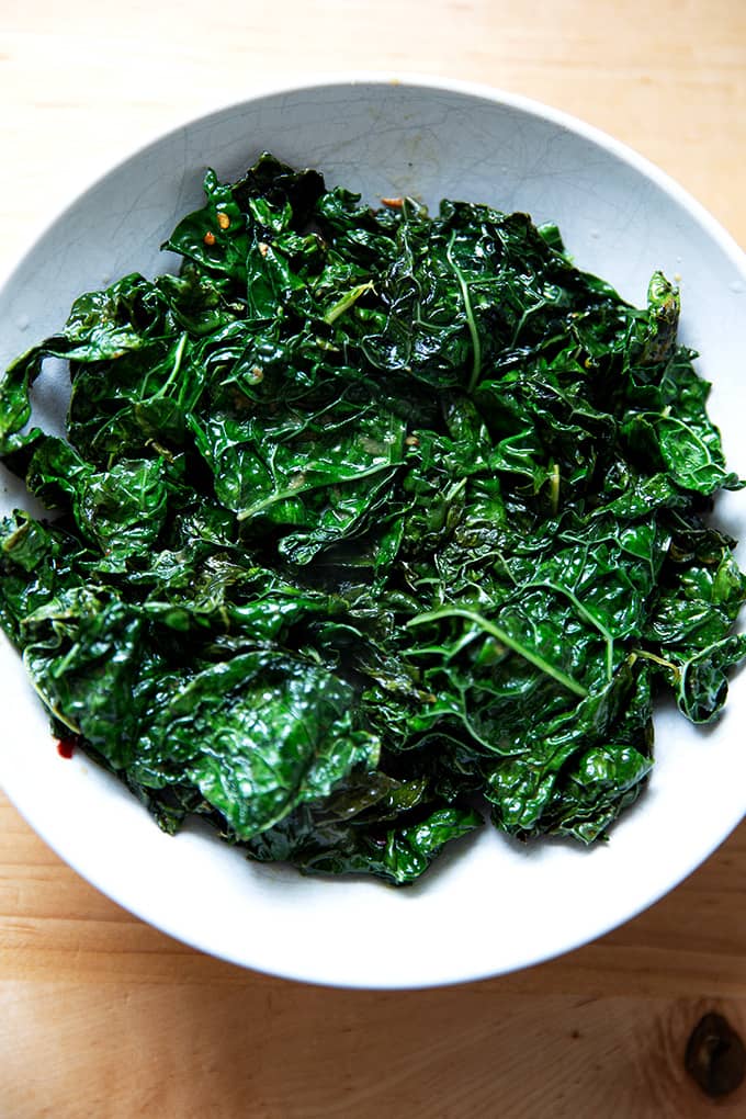 Quickly sauteed kale: Heat 2 tablespoons of olive oil over high heat, add 10 t0 12 ounces roughly chopped kale, season with salt (and a few shakes of garlic powder — see below — and crushed red pepper flakes), saute for 1 to 2 minutes, then add a splash of vinegar. Done! (Find a similar recipe with escarole here.)