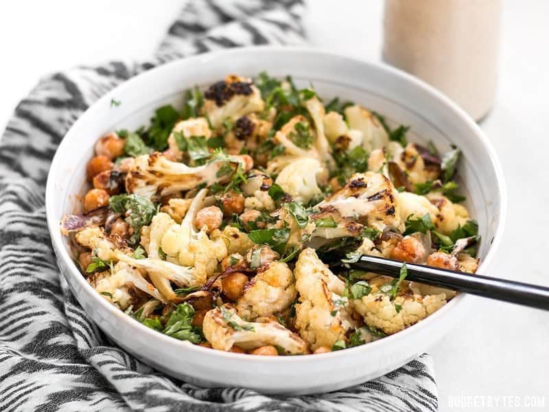 Combining sweet roasted red onions, spiced chickpeas, tender cauliflower, and a tangy lemon tahini dressing.