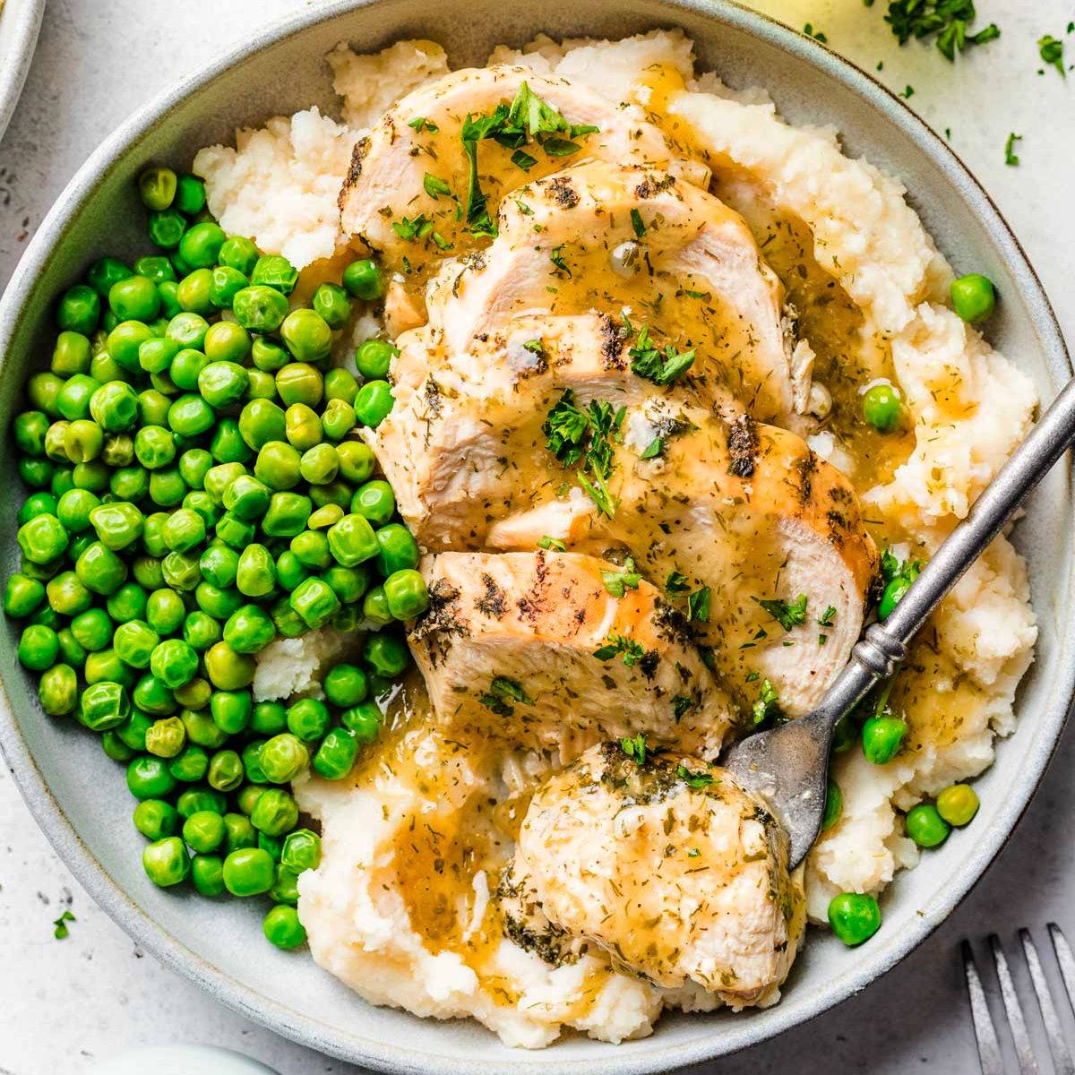 We like to serve this easy instant pot chicken breast with mashed potatoes, pea salad and dinner rolls!