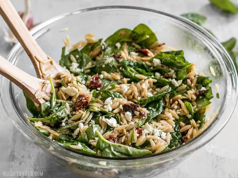 A quick homemade balsamic vinaigrette makes this simple Spinach and Orzo Salad extra special. Serve as a light lunch or a side with dinner.