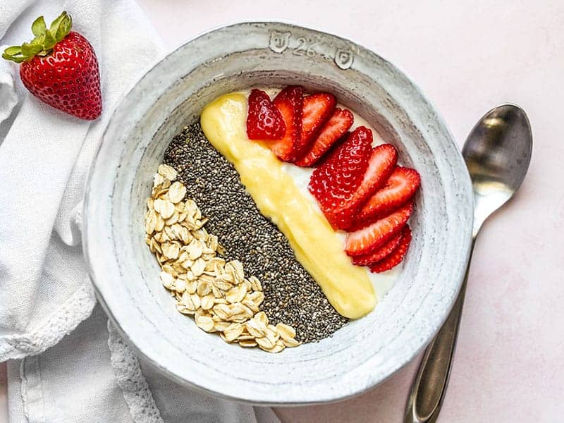Creamy yogurt and bright, citrusy lemon curd make a dreamy base. A few oats, chia seeds and berries make it complete.