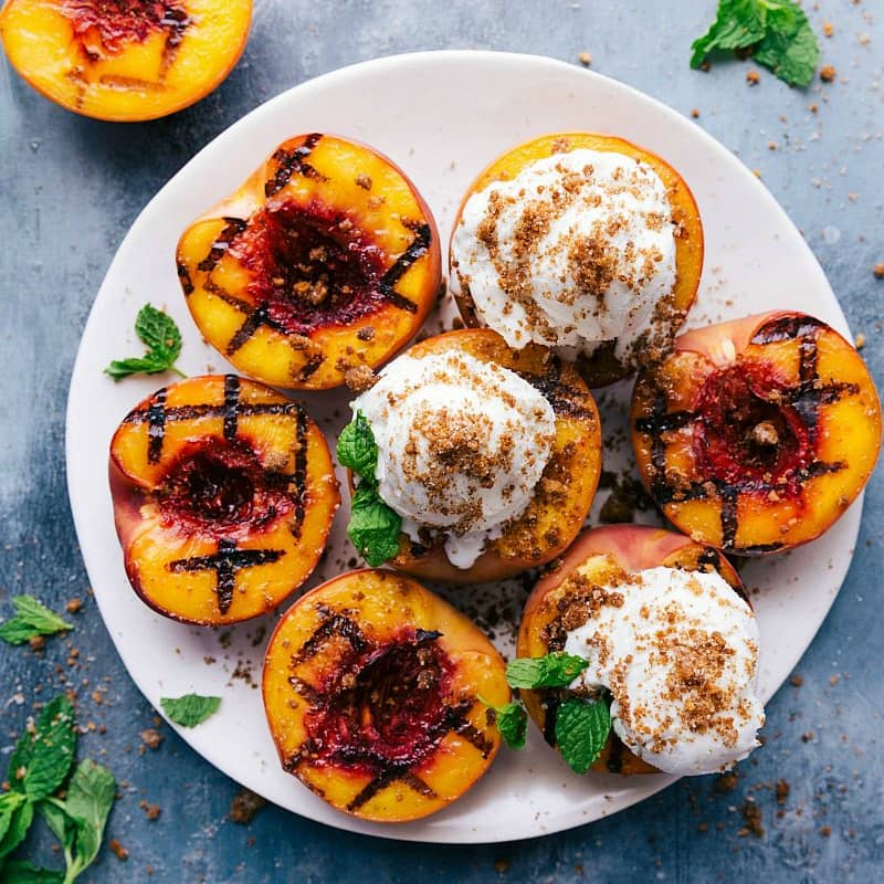 3. Grilled Peaches: Grilled peaches make for the ultimate summer treat! These peaches are prepared in sundae form with brown sugar cinnamon rubbed peaches, vanilla bean ice cream, and a delicious graham cracker crumble.