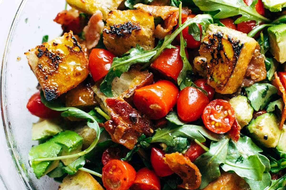 Mid-Week Pick-Me-Up BLT Panzanella The best salad of summer! Fried bread, arugula, tomatoes, bacon, and an easy balsamic dressing. YUM!