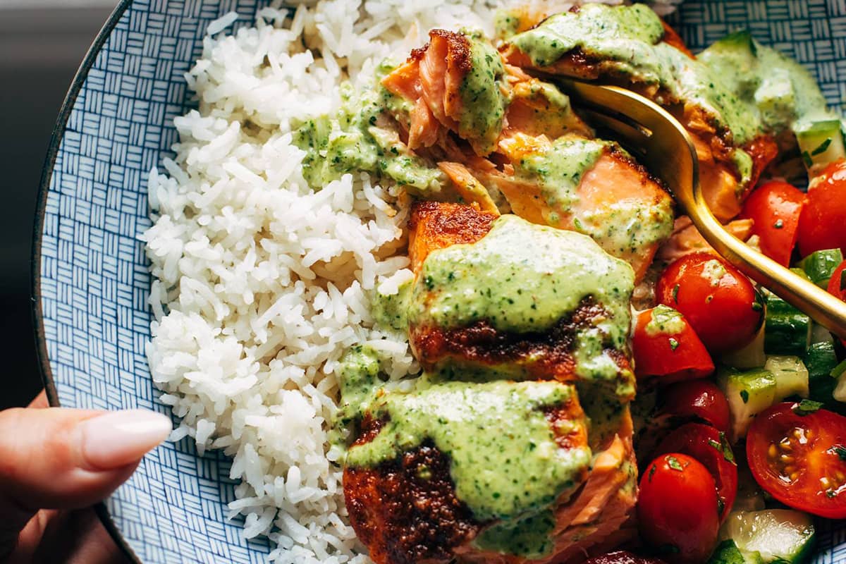 That bright green basil sauce might just be the green sauce of summer 2023 for me! Pour it over spice-loaded, caramelized salmon, throw a little tomato corn salad on the side, and you have a very happy dinner.