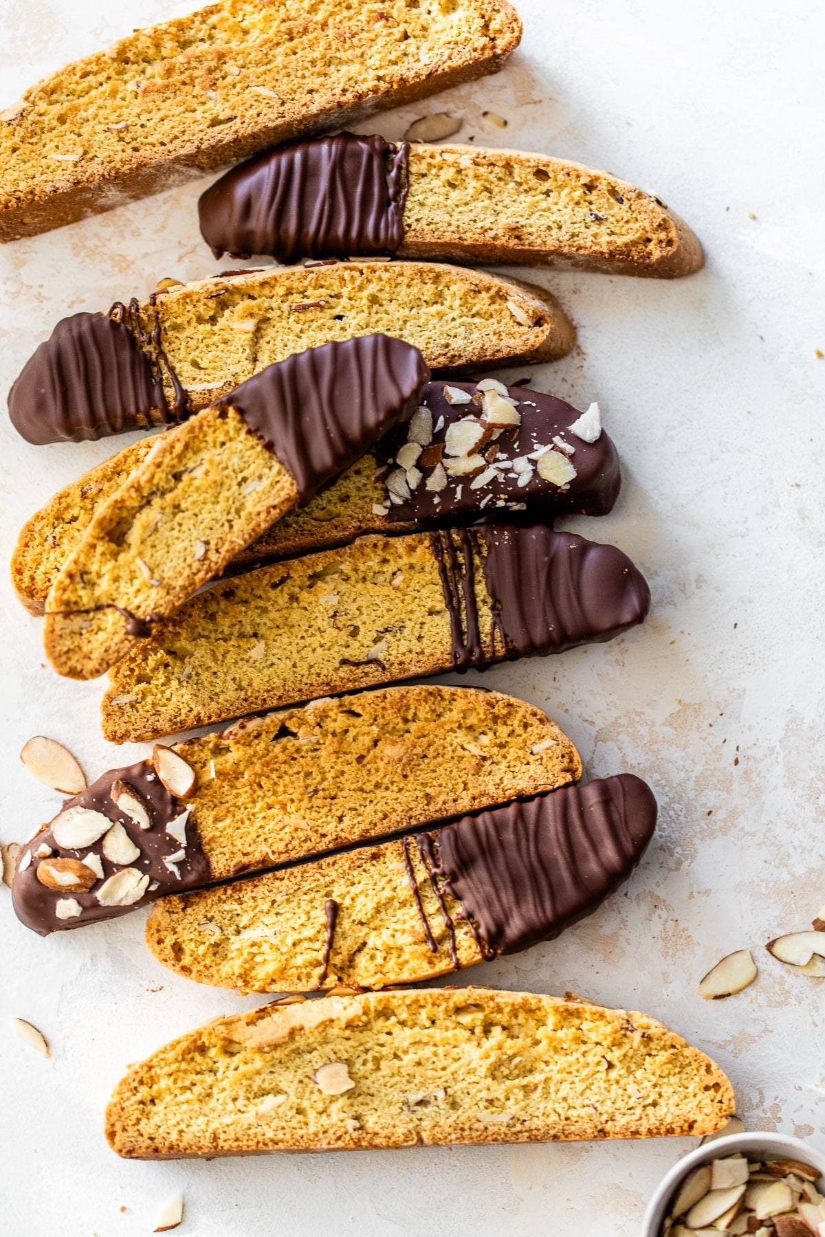 A hot cup of coffee just isn't the same without Almond Biscotti for dunking. Coated in chocolate and loaded with rich nutty flavors, this classic Italian cookie is the ultimate treat to pair with coffee and tea after dinner. There's nothing better than the almond flavors of the biscotti mixed with the chocolate covering the tops of each biscuit!