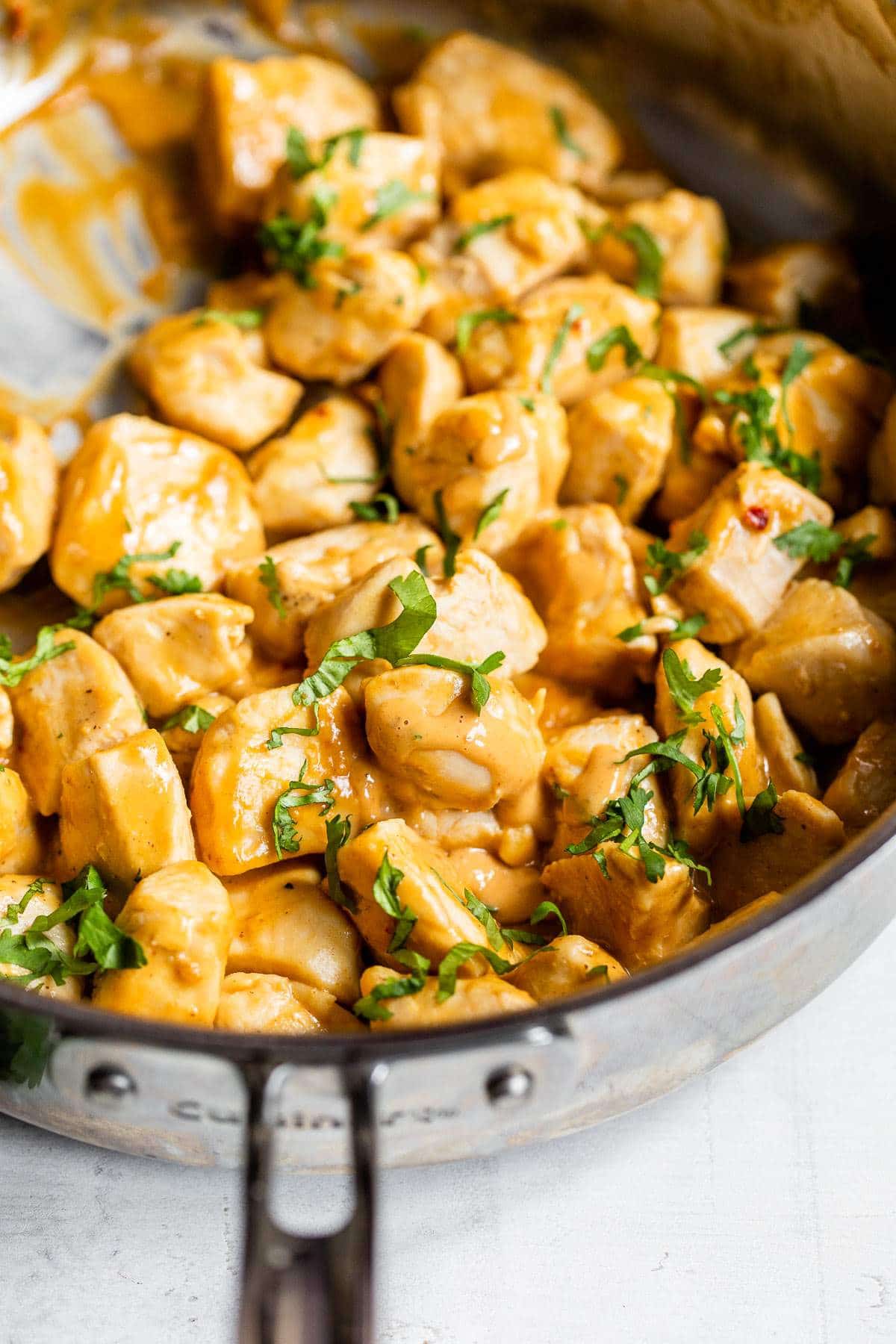 It doesn't get much easier than this Peanut Chicken Skillet! The chicken is cooked in the skillet, then tossed in a simple peanut sauce and sprinkled with cilantro. The whole dish comes together in 10 minutes, and it makes for the best leftovers. So incredibly easy and quick to make which honestly just makes me want to make this more and more!