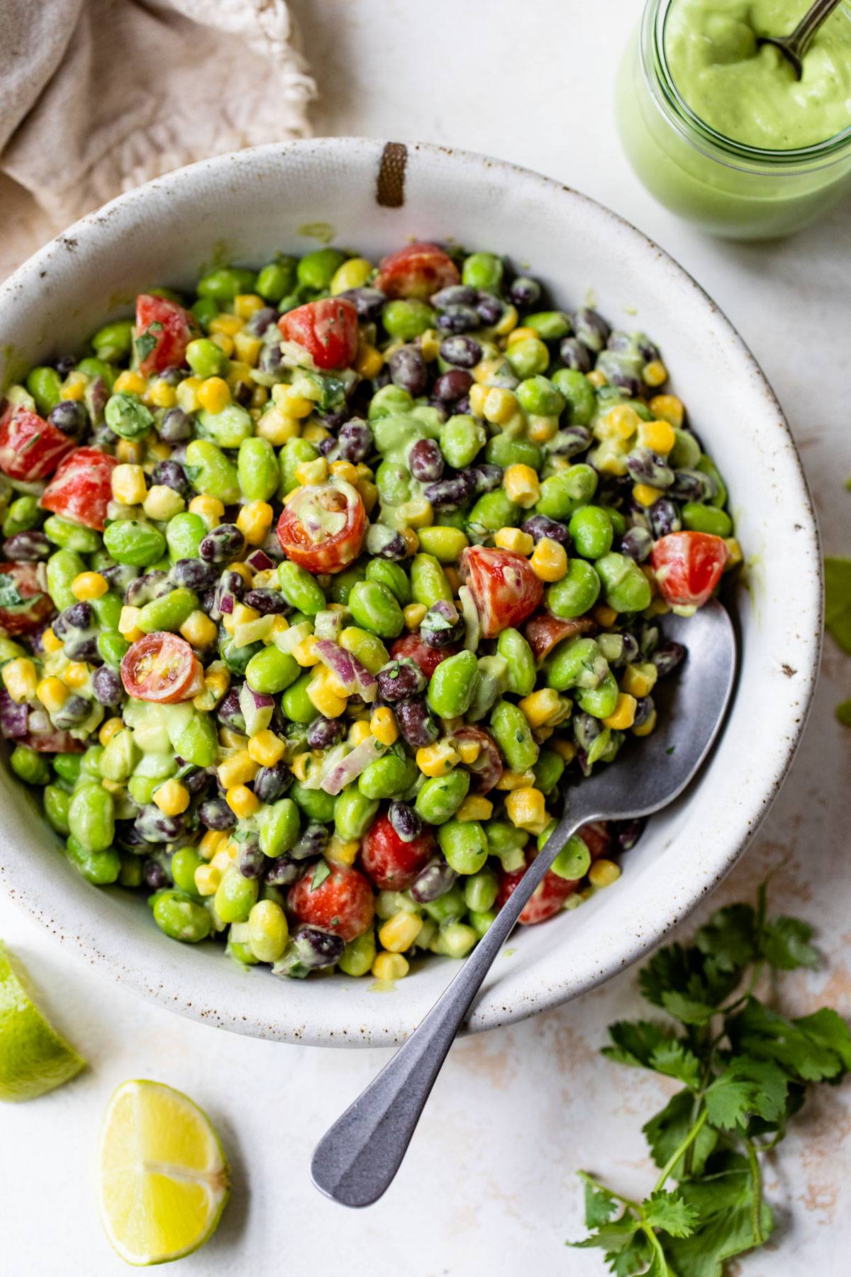 This easy Edamame Salad makes eating the rainbow fun! Edamame, black beans, corn, tomatoes, and red onion are dressed in my spicy avocado dressing. Enjoy it as a quick and refreshing summer salad or party dip to serve with tortilla chips. This is such a refreshing summer recipe perfect for weekday lunches or a light dinner!