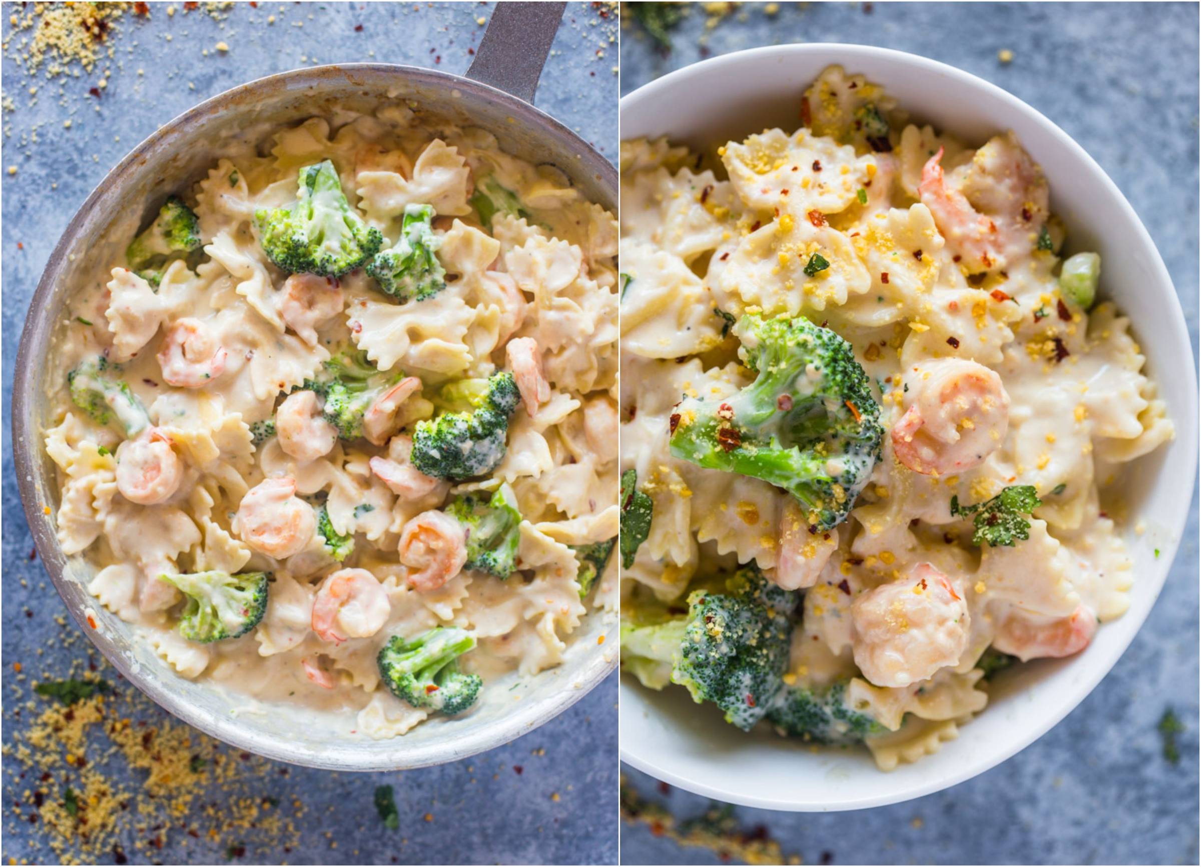 Pan-seared garlic shrimp, broccoli, and pasta tossed in creamy lightened-up garlic alfredo sauce that contains no cream!