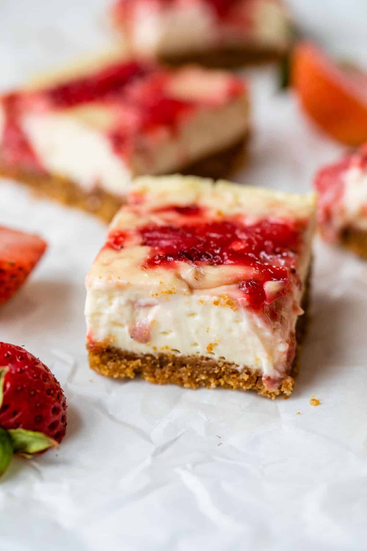Hi friends! Just popping in to let you know that the July cooking challenge recipe is my Strawberry Cheesecake Bars. These bars just SCREAM summer with yummy cheesecake flavors and strawberries on top of a graham cracker crust! What more could you ask for?!