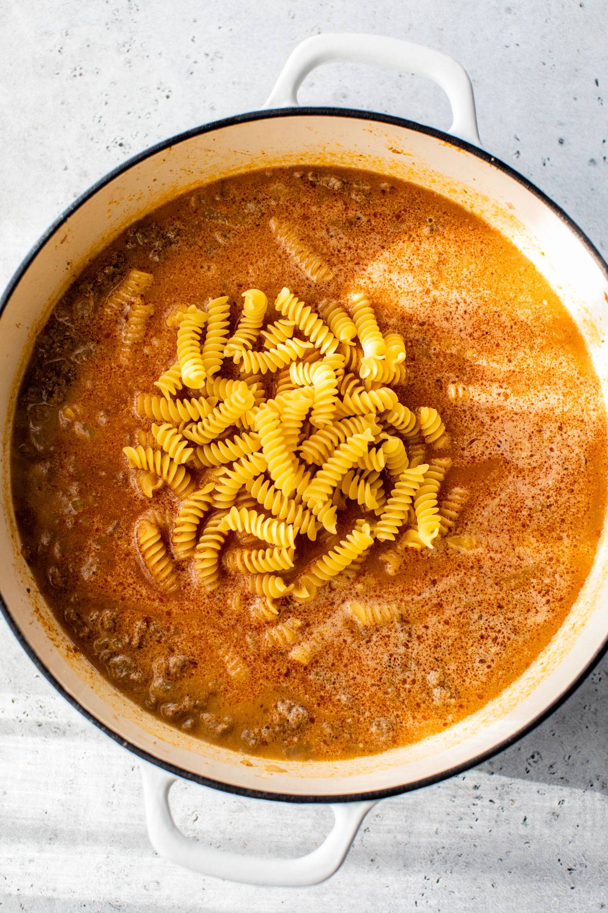 - Bring mixture to a boil, then cover and reduce to a simmer. Simmer for 8-11 minutes until the pasta is cooked.