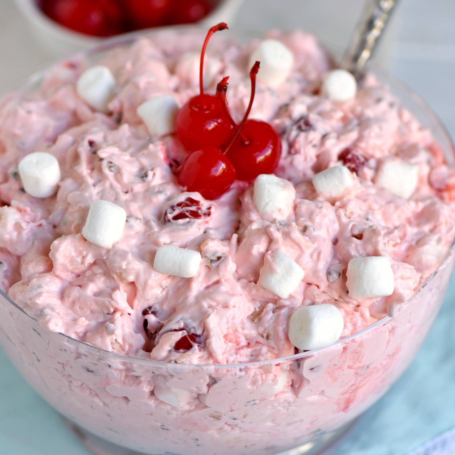 Cherry Fluff dessert salad is one of my favorite no bake dessert recipes! This easy dump and go salad is perfectly sweet, pretty and pink! It's one of the quickest desserts you'll ever make (takes about 5 minutes) and is great for parties and potlucks.