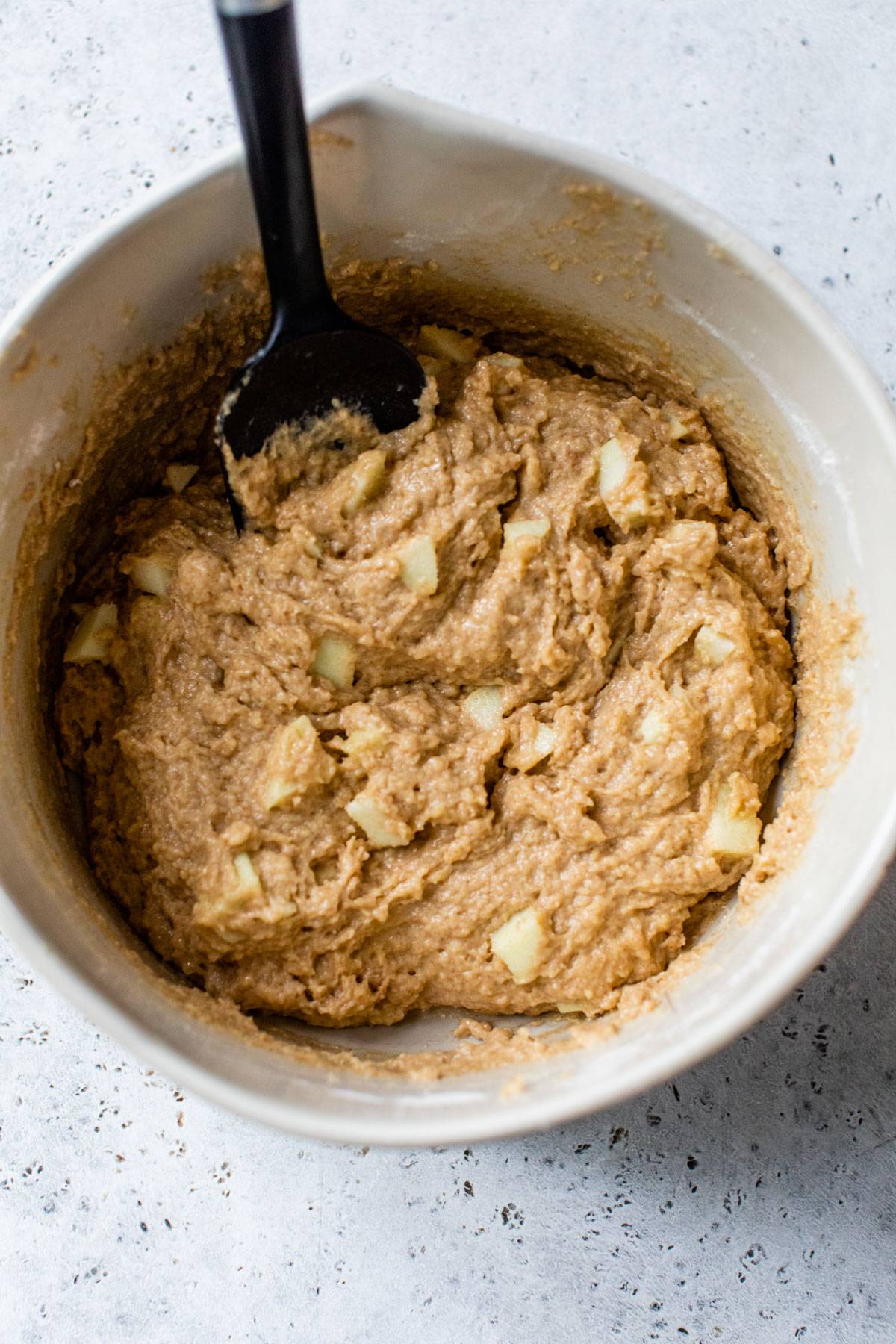 - Pour the wet ingredients into the dry ingredients and mix. When the batter is just about to come together (a tiny bit of fry ingredients showing is fine), fold in the apples until the batter is completely mixed.