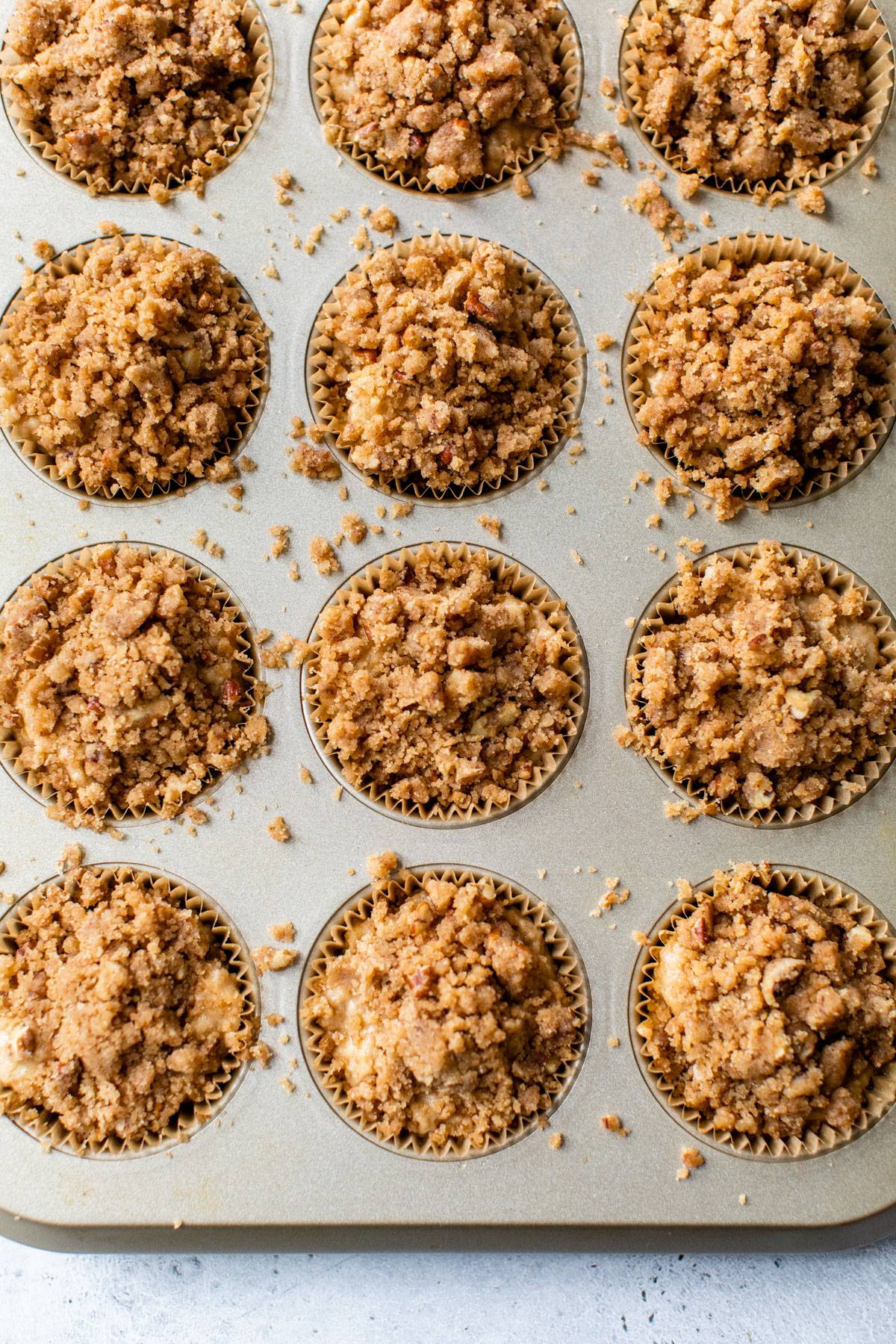- Take the crumble and place a good amount on top of each muffin, crumbling it between your fingers to break it up and is evenly distributed.