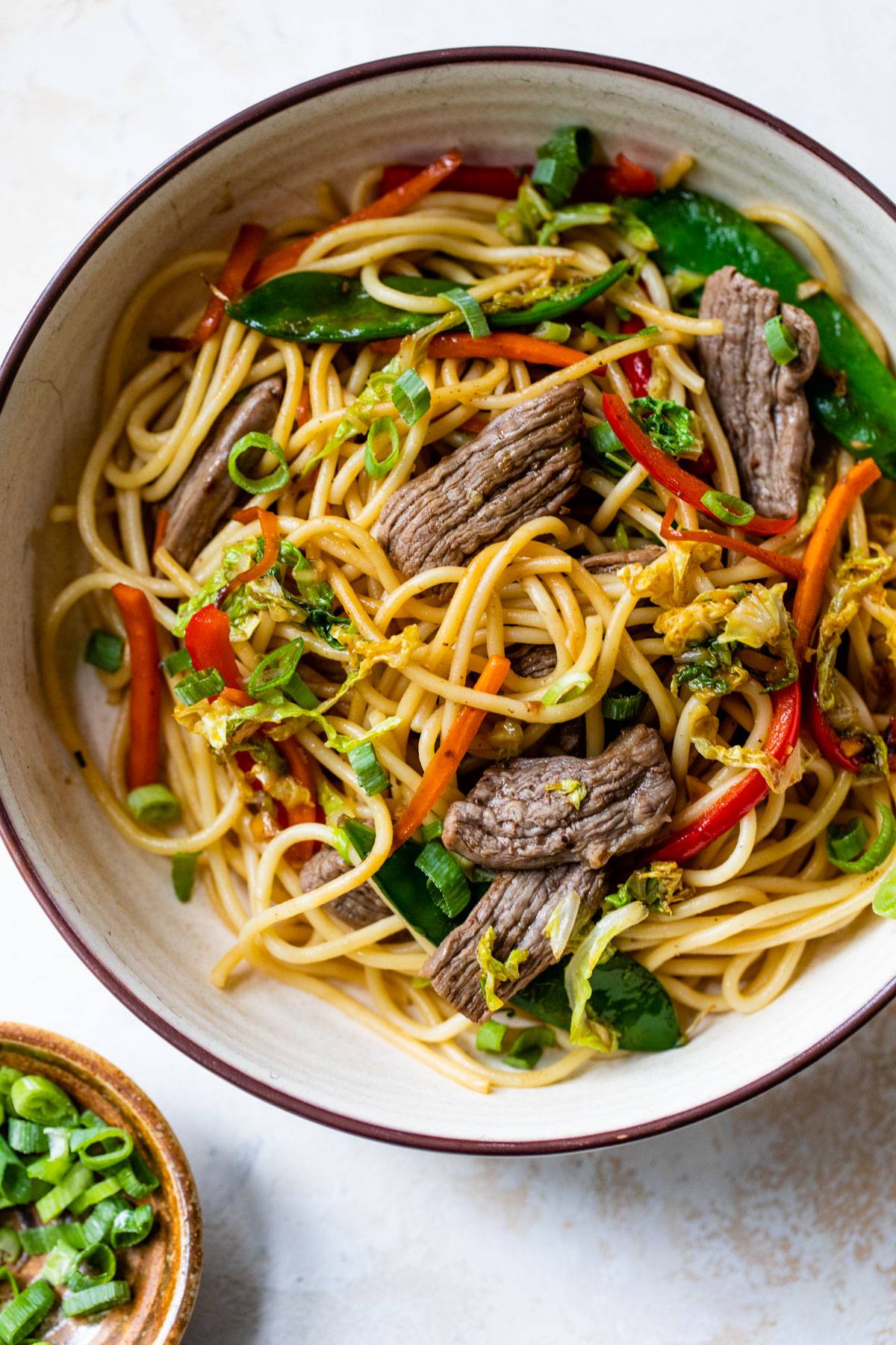 This simple Beef Lo Mein recipe is made with flank steak, cooked vegetables and a simple soy sauce-based marinade. It's an easy, flavorful weeknight meal that's ready in about 20 minutes and tastes similar to your favorite Chinese takeout. This is an absolute recent fave of mine because it's so quick to make and is so dang delicious!