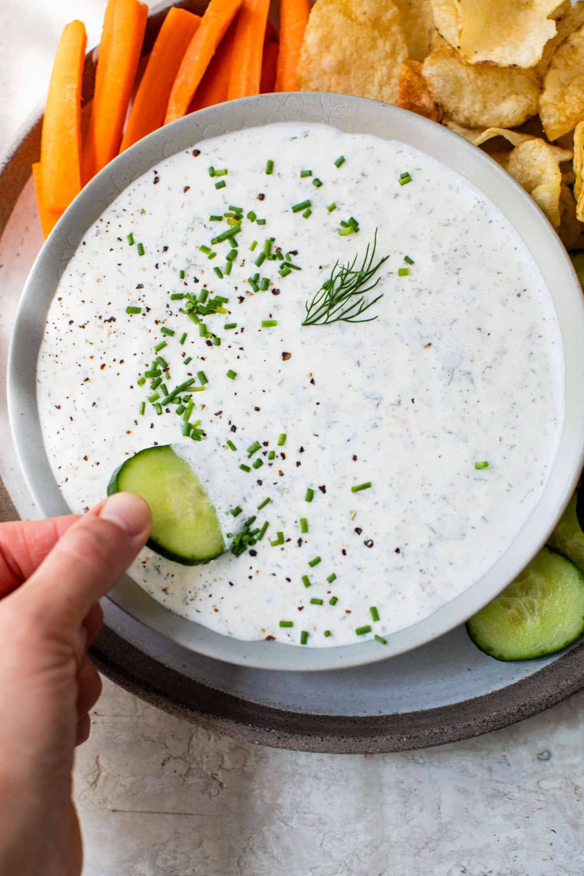 This Cottage Cheese Dip is light, healthy, and has all of the characteristics of a crave-worthy ranch dressing. No fancy ingredients or equipment needed. Just stir and serve! A healthier version of a classic ranch style dip.
