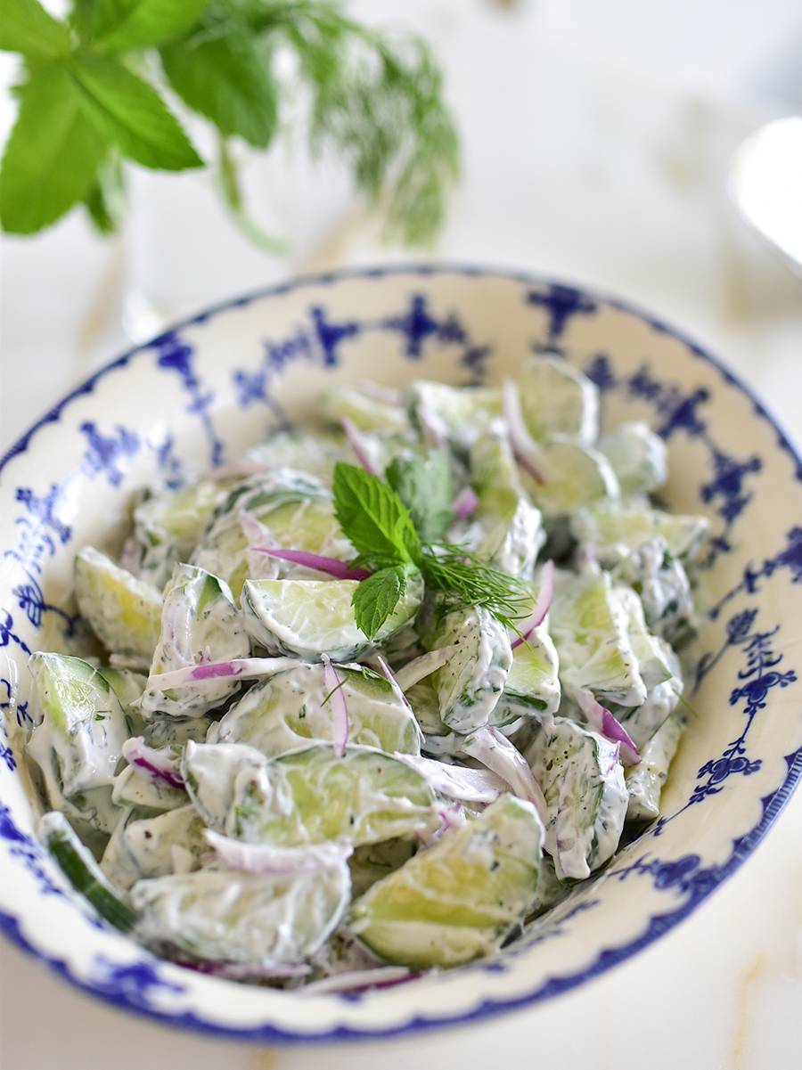 Mine don't always look this fancy. Sometimes I just quick-chop the cukes and stir them into plain yogurt or laban with garlic and mint salt. Done. And done so well!