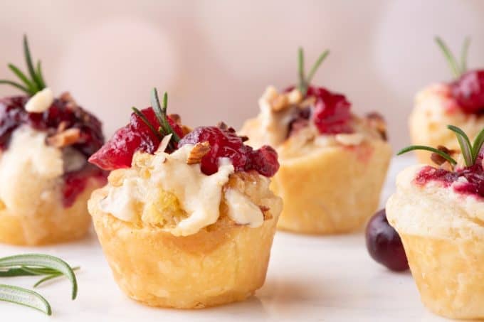 These Cranberry Brie Bites are the perfect appetizer for your holiday parties! They are the perfect combination of creamy and salty with a subtle burst of tart cranberry sauce over rich brie cheese. These buttery puff pastry snacks are pockets of ruby-red goodness that look gorgeous on a serving platter.