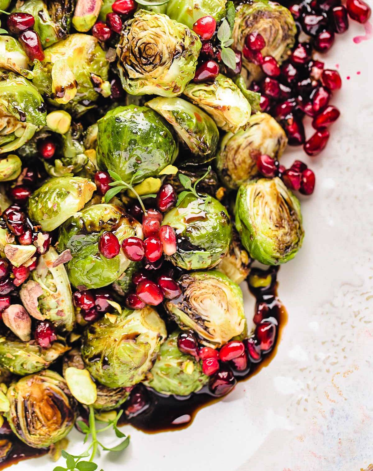 This delicious Roasted Brussels Sprouts recipe is a simple yet impressive side dish for any occasion! The Brussels sprouts are roasted until crispy, tossed with pistachios and pomegranates and coated with a luscious balsamic glaze creating a symphony of flavors and textures that is hard to resist!