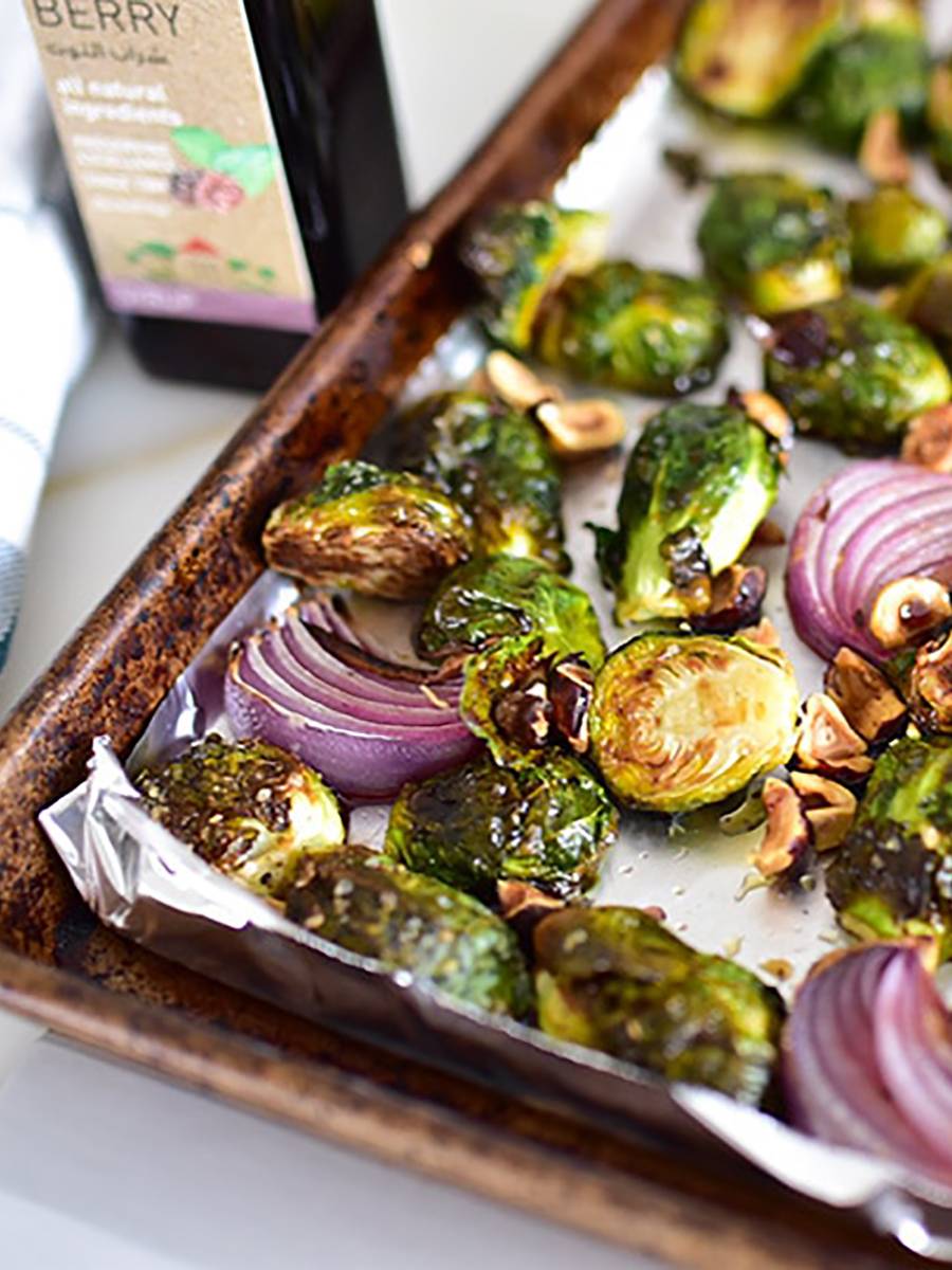 Make a lot...these are as delicious with dinner as they are for lunch or a snack. The hazelnuts and red onion add so much, as does the pomegranate molasses for a bright finish.