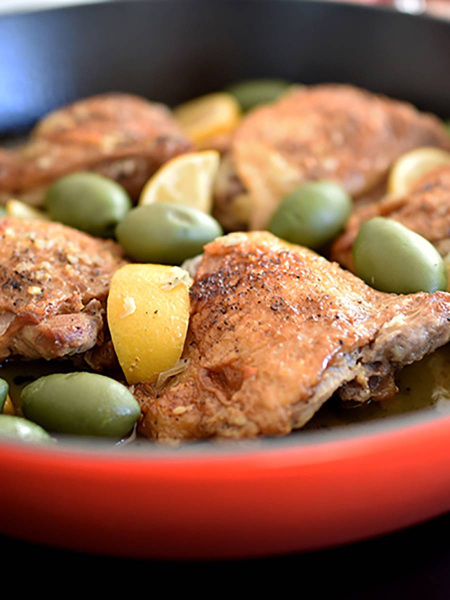 The recipe uses skin-on, bone-in thighs and buttery Castelvetrano olives. We consider this dish a treat because the flavors are so exciting and delectable!