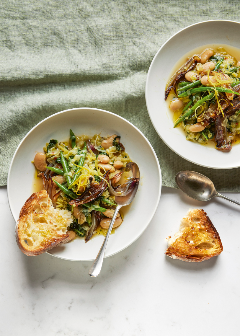 Book sneak preview Roasted Shallot & Butter Bean Bowls | | "I imagine lots of people might skip past this recipe – roasted shallots don't tend to carry the same appeal as veggies like sweet potatoes, but roasting them in their skins ensures they're perfectly sweet and tender, so please trust me on this one, it's a must and one of my favourite recipes in the book. It feels like one giant, very cosy, nourishing hug." | | SERVES: 2 TIME: 30 minutes INGREDIENTS 5 shallots, quartered lengthways, keeping the root intact and the skin on 3 tablespoons olive oil, plus extra to serve (see tip below) 4 garlic cloves, skin on 1 teaspoon thyme leaves, finely chopped, or 1 teaspoon dried thyme pinch of dried chilli flakes (optional) 2 leeks, sliced 120g green beans, trimmed 1 × 400g tin of butter beans 2 large handfuls of baby spinach (about 100g), roughly chopped 1 tablespoon white wine vinegar grated zest of 1 lemon sea salt and black pepper sourdough toast, to serve (optional) | | METHOD 1. Preheat the oven to 180°C fan. Toss the shallots with a tablespoon of the olive oil and a pinch of salt. Place on a baking tray, cut-side down, add the garlic cloves and roast in the oven for 25–30 minutes, until soft and caramelised. 2. Warm the remaining 2 tablespoons of oil in a large frying pan or shallow casserole, over a medium–low heat. Add the thyme, chilli flakes (if using), leeks and a pinch of salt and cook for 10 minutes, until the leeks have softened but not coloured.
