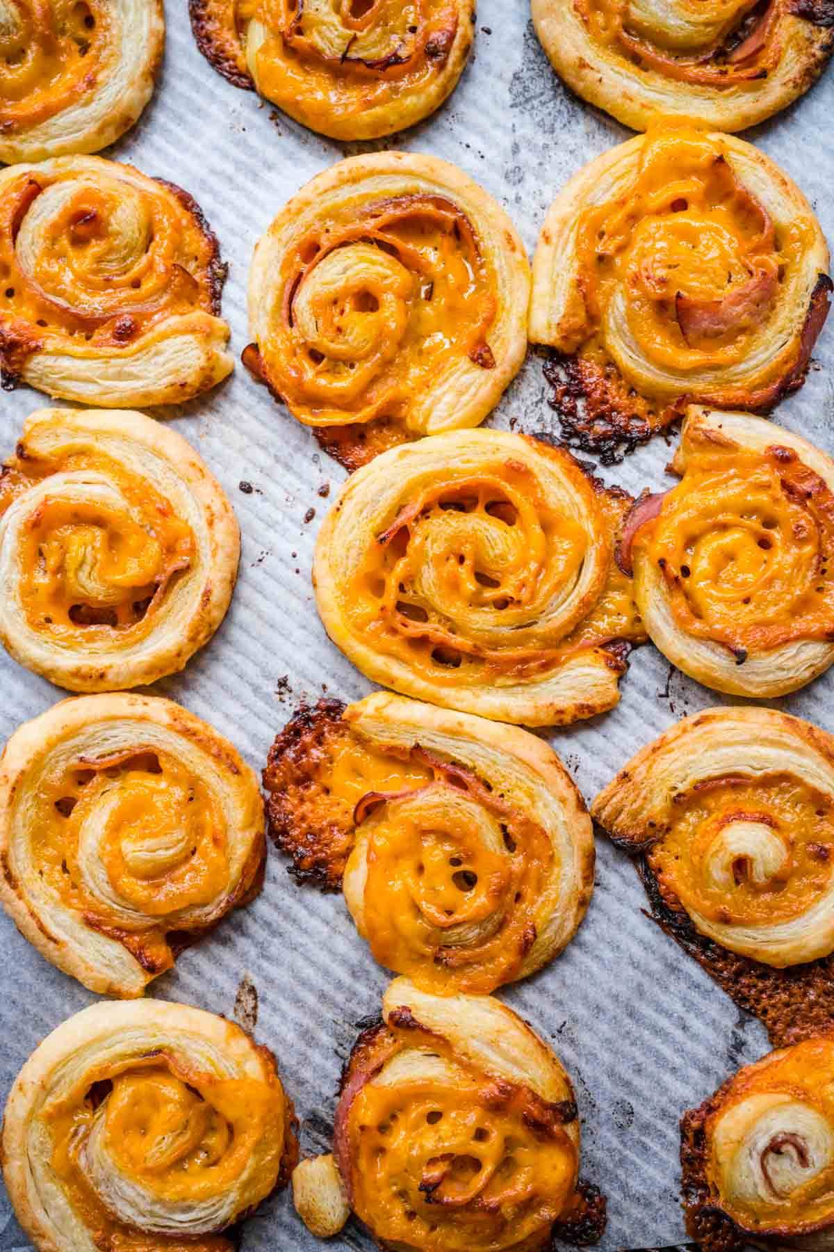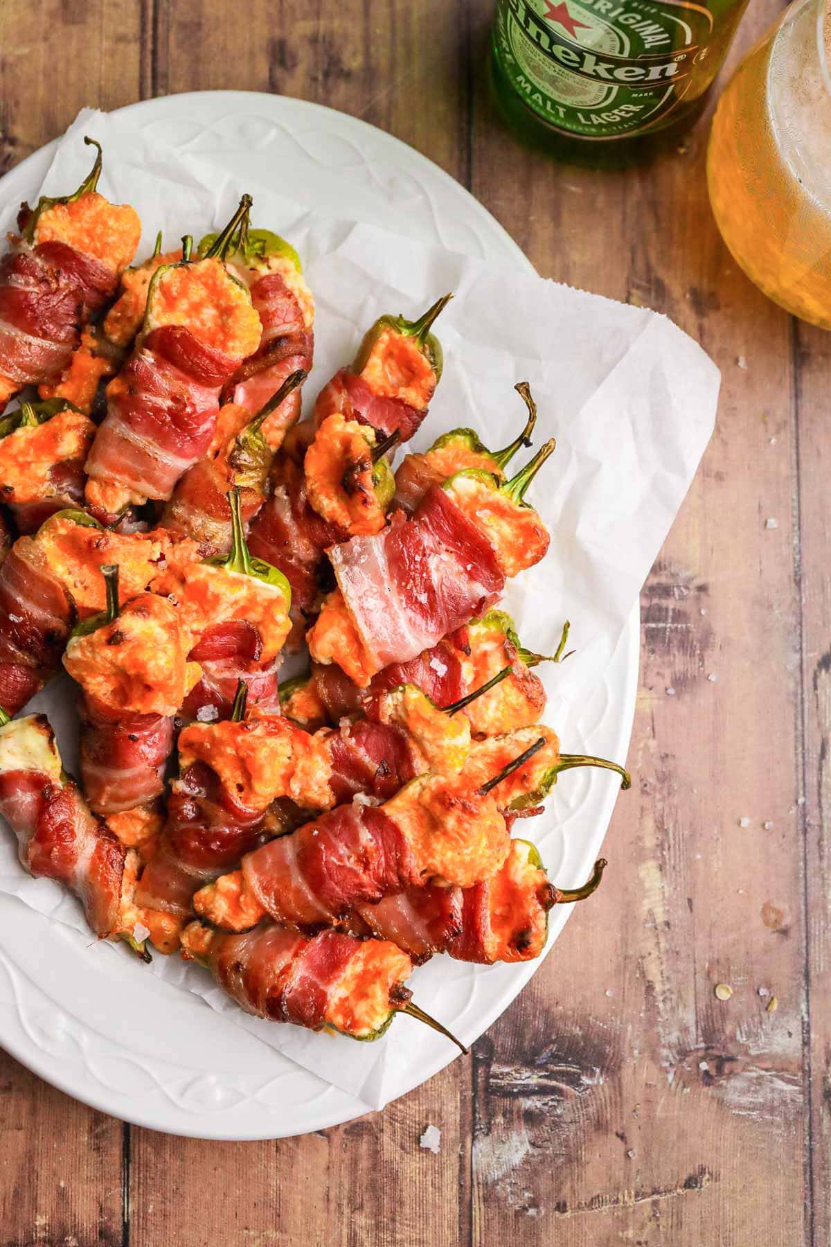 Jalapeno peppers stuffed with cream cheese and cheddar, wrapped in bacon, then baked.