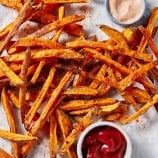 Learn how to make crispy baked sweet potato fries in the oven! Olive oil, salt, and savory spices pack this healthy snack with irresistible flavor.