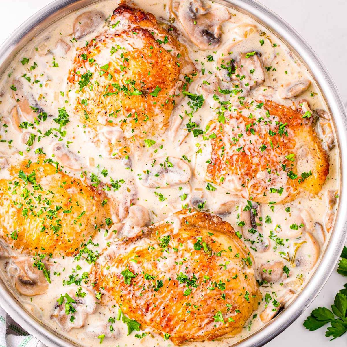Chicken FricasseeA classic French recipe made with browned chicken thighs cooked in a decadent white wine mushroom sauce flavored with shallots, herbs and cream. A delicious, comforting dish that is perfect for weeknights or cozy weekends at home.