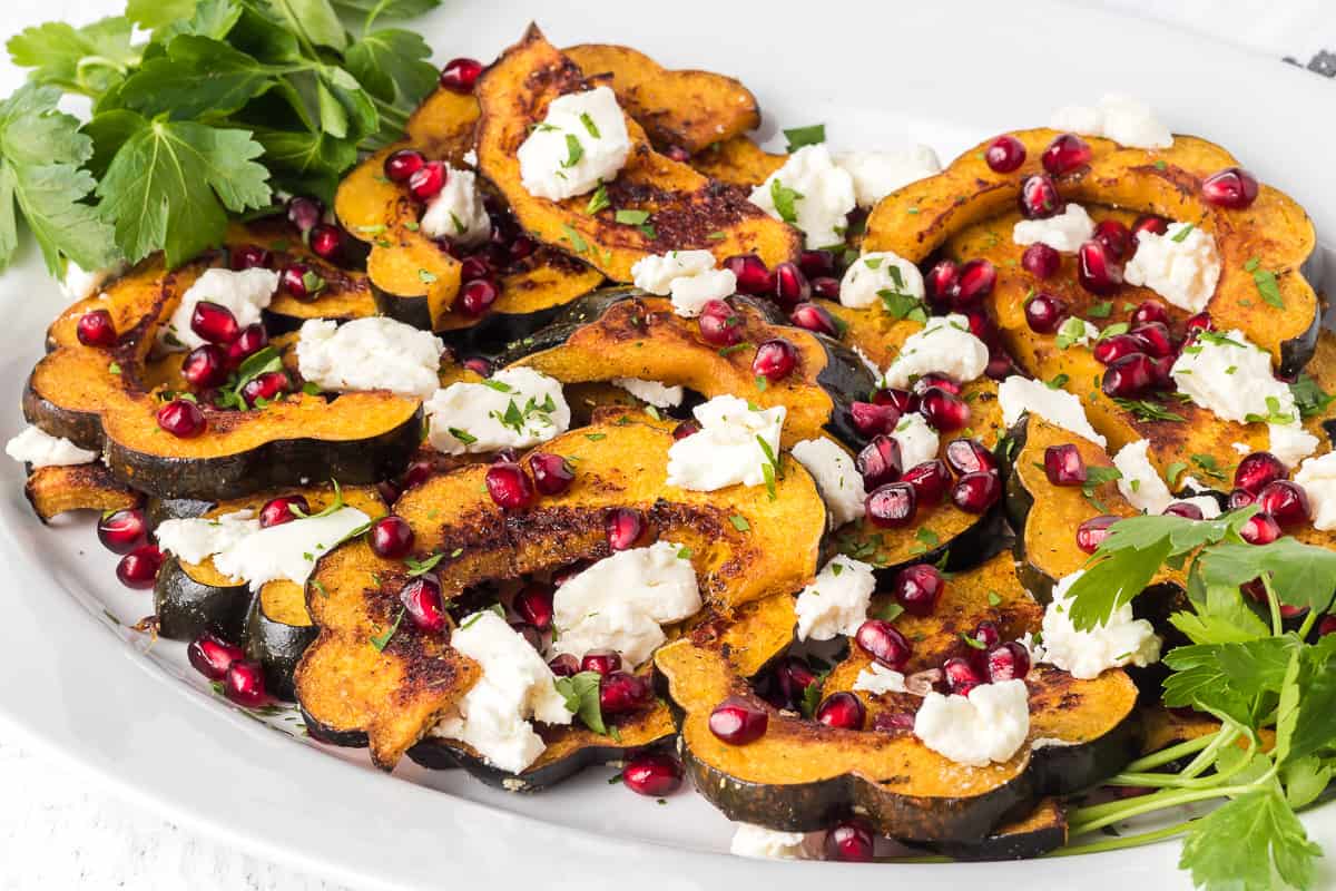 Enjoy the flavors of all with this easy Roasted Acorn Squash recipe! Tossed with olive oil and fragrant spices, and served with goat cheese and pomegranate arils, this is the perfect side dish to share with your family and friends! It also makes a great and beautiful addition to your holiday table!