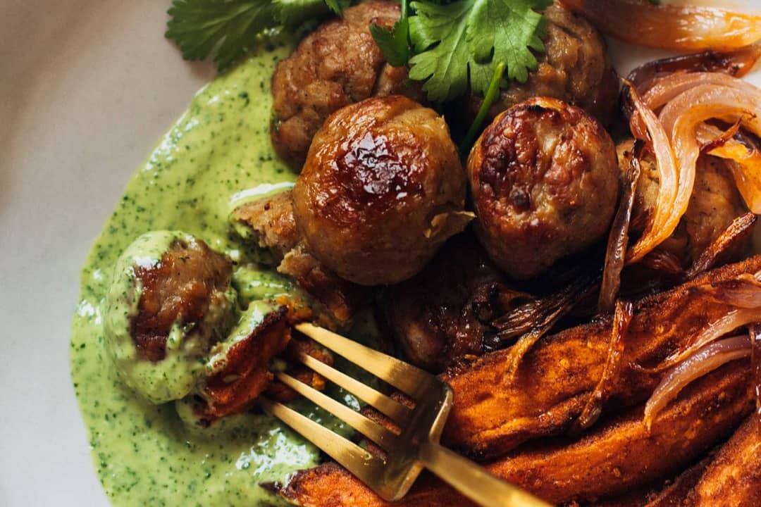 Oh these are so good. Seasoned sweet potato wedges and chicken meatballs or rotisserie chicken all piled onto a plate with a little puddle of punchy green avocado mojo sauce.