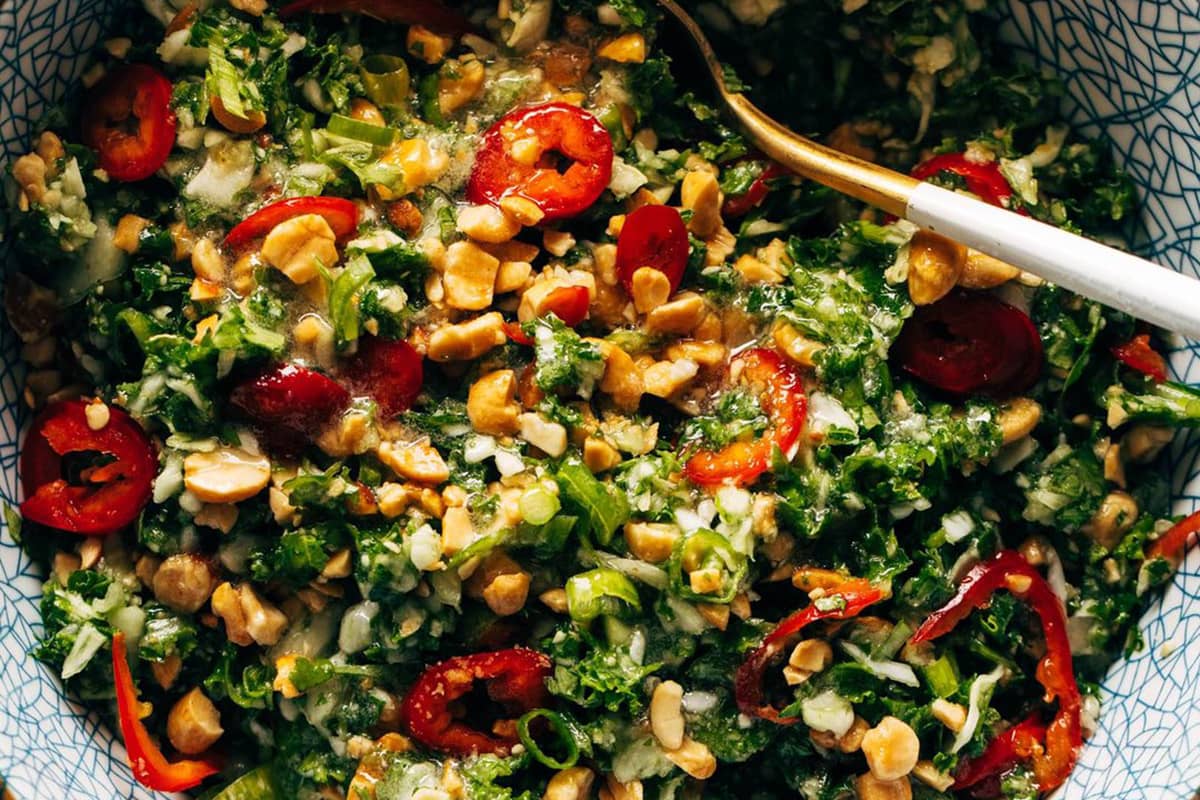 This was the most-loved recipe all year long! Crunchy kale and cabbage, fresh herbs and fresno peppers, chopped peanuts, and a perfect roasted peanut vinaigrette that tucks into all the salad nooks and crannies.