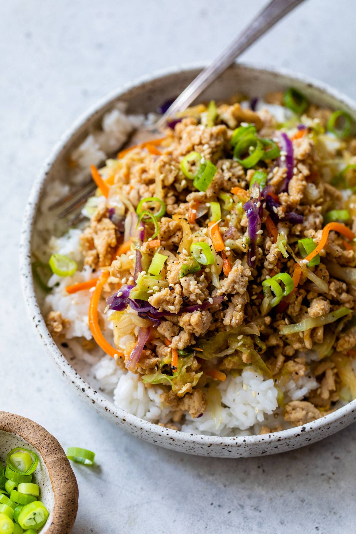 This 20-minute Egg Roll in a Bowl recipe has everything you love about classic Chinese egg rolls! A savory ground chicken and cabbage-carrot mix is served over white rice to give you a flavor-packed meal prep option or a healthy dinner. Love love love this meal because it is so easy and comes together in a flash!