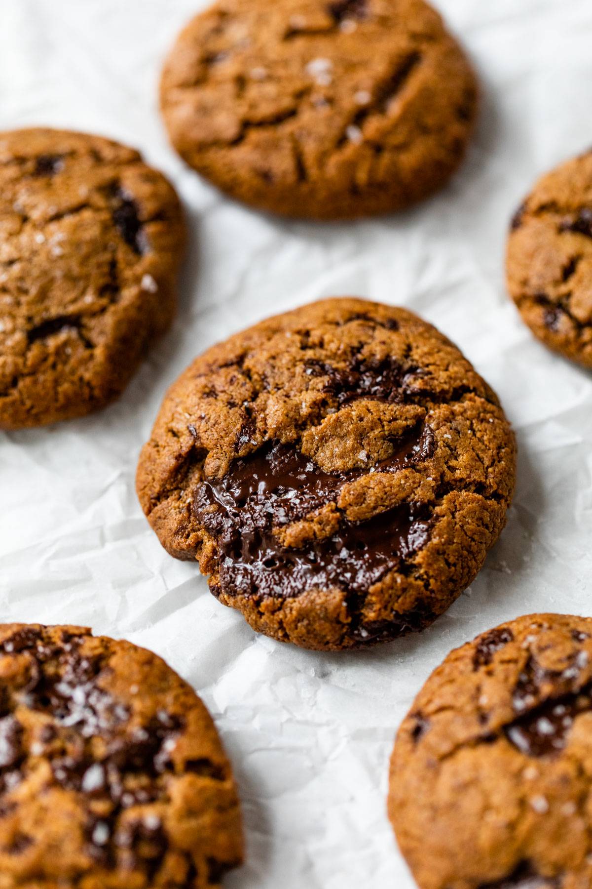 You can feel good about indulging in these 5-ingredient Flourless Chocolate Chip Cookies. With crisp edges, chewy centers, and gooey melted chocolate in every bite, it's hard to believe they're a healthy and naturally gluten-free treat! Such an indulgent cookie yet still healthier than traditional chocolate chip cookies!