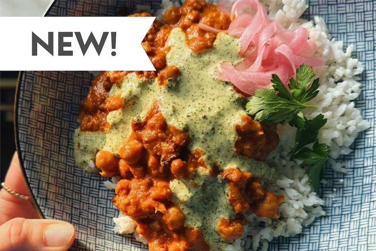 This Butter Cauliflower and Chickpeas is a new weeknight staple! Roasty spiced cauliflower, a jar of butter sauce, a can of chickpeas, and a pile of steamy rice with a waterfall of mint sauce on top.
