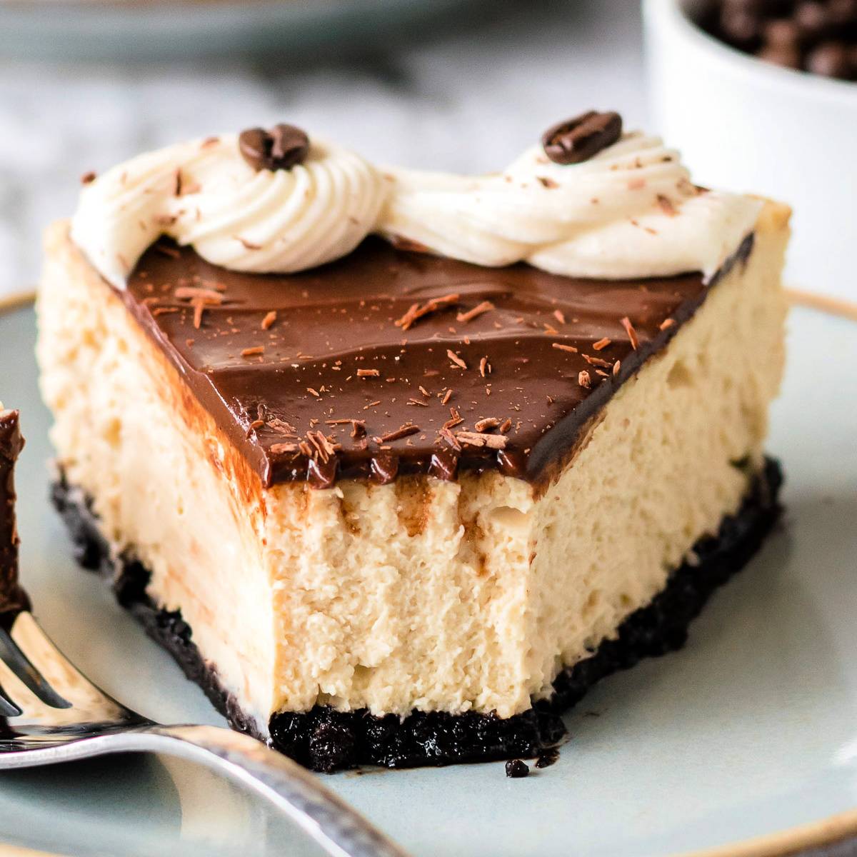 Espresso Cheesecake is the perfect dessert for coffee and chocolate lovers! Rich, silky espresso cheesecake sits on an OREO crust and is topped with chocolate ganache, cream cheese frosting swirl, chocolate shavings and espresso beans! Delish!