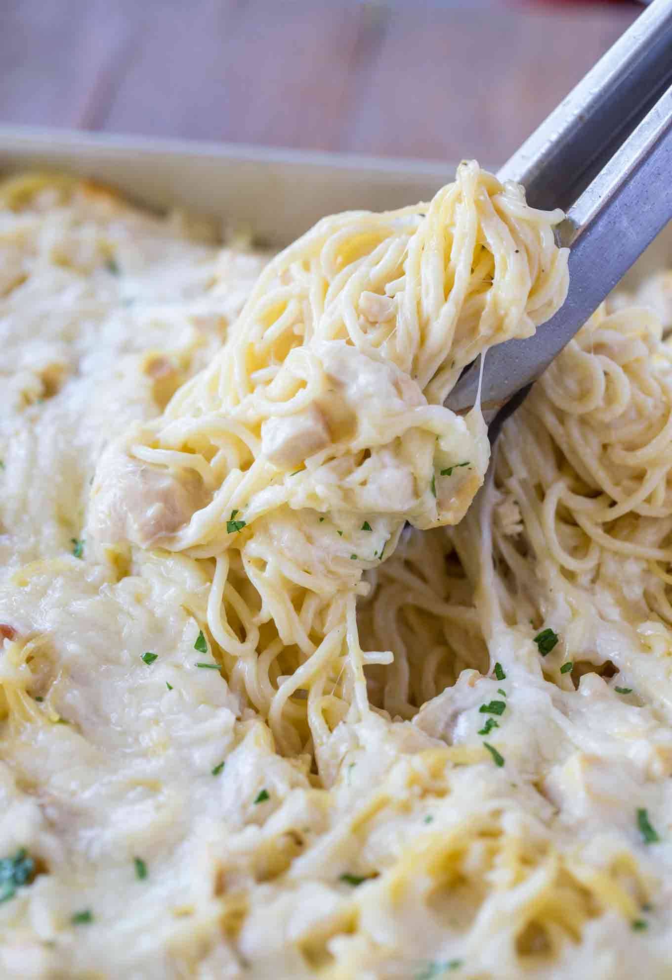 Yummy, creamy baked chicken and mushroom pasta dish with chunks of chicken and mozzarella cheese