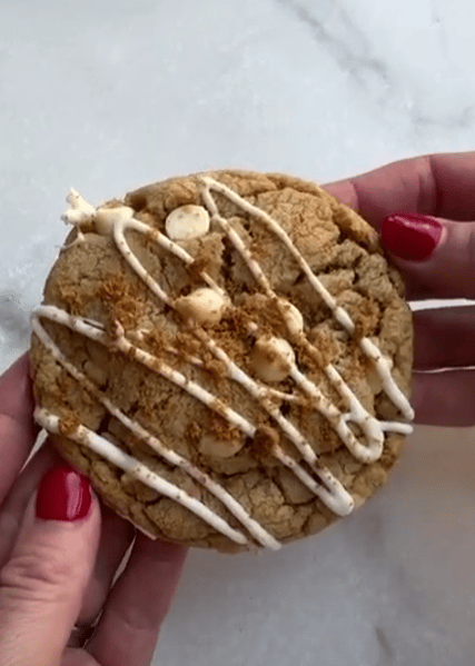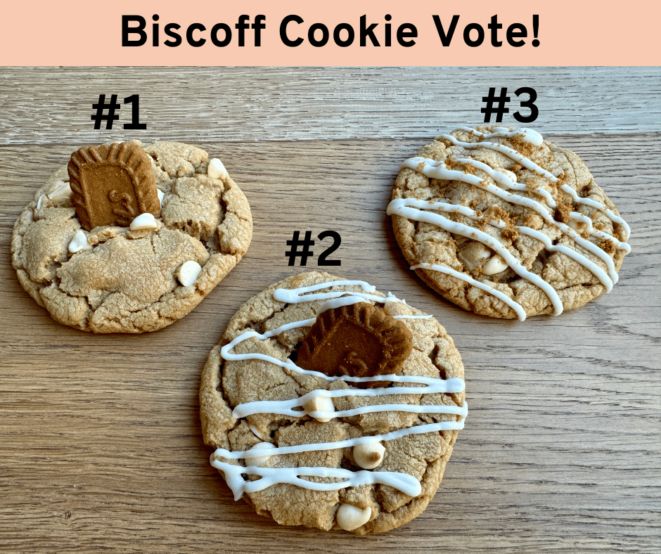 | Hi there reader, As promised, here is the Biscoff Cookie recipe- before it gets published on my website! The winner is #3! Biscoff Cookies Yield: 2 dozen cookies Ingredients: 1 cup unsalted butter, cold room temp 1 1/2 cups light brown sugar 1/2 cup granulated sugar 14 oz container lotus cookie butter*, divided (about 1.5 cups cookie butter or speculoos) 2 large eggs, room temp 1 large egg yolk 2 teaspoons vanilla extract 3 cups all-purpose flour 1 teaspoon baking soda 1 teaspoon baking powder 1 teaspoon kosher salt 11 oz bag white chocolate chips, divided cups For Topping (Optional): 10 whole Biscoff cookies, crushed ½ cup vanilla melting wafers or chopped almond bark melted for drizzle (optional) Instructions Preheat oven to 375 degrees F. Line a baking sheet with parchment paper. Line a plate or second small baking sheet with a small piece of parchment paper. Measure out 1 cup of cookie butter to use in cookie dough. With the remaining ½ cup cookie butter, scoop 24 small scoops (about 1 teaspoon size) onto parchment paper and place in the freezer while you make the cookie dough. To the bowl of a stand mixer, add butter, white sugar, and brown sugar and mix for 1 minute. Add 1 cup cookie butter and mix for 2-3 more minutes, until light colored and fluffy. Add eggs, egg yolk, and vanilla and mix until well combined. Add flour, baking soda, baking powder, and salt and mix to combine. Stir in 1 ½ cups white chocolate chips. Scoop dough into 24 balls, about 3 Tablespoon-size, or 70 grams, if you want to measure with a scale. Remove cookie butter scoops from the freezer. Press a deep indention into the center of a cookie dough ball and add one of the cold balls of cookie butter. Seal to close, and roll back into a ball. Top each cookie dough ball with a few extra white chocolate chips. Place dough balls on a large plate and refrigerate, covered, for 30 minutes before baking. Bake cookies on a prepared baking sheet, 1'' apart (I fit 12 to a baker's half sheet pan) for 12-15 minutes or until the cookies are no longer shiny on top. Don't overbake. Allow cookies to cool on a baking sheet for at least 15 minutes before removing them to a wire cooling rack. Melt vanilla melting wafers in the microwave according to package instructions and drizzle over cookies. Top with Biscoff cookie crumbs. Cookie Butter: should be easy to find at any grocery store (Walmart, Target, and Amazon carry the Lotus brand), or use Speculooks Cookie Butter from Trader Joes, or store-brand cookie butter found near the peanut butter. To Make Ahead: Biscoff cookie dough can be stored in the fridge for 1-2 days. To Freeze: You can freeze cookie dough balls, or baked cookies, in an air-tight freezer-safe container for up to 3 months. New Baking Email Series! Did you know I have a new baking email series that is published every Tuesday? I'll compile a themed email full of delicious baked goods for you to try. If you love to bake, you are gonna want to see this collection!