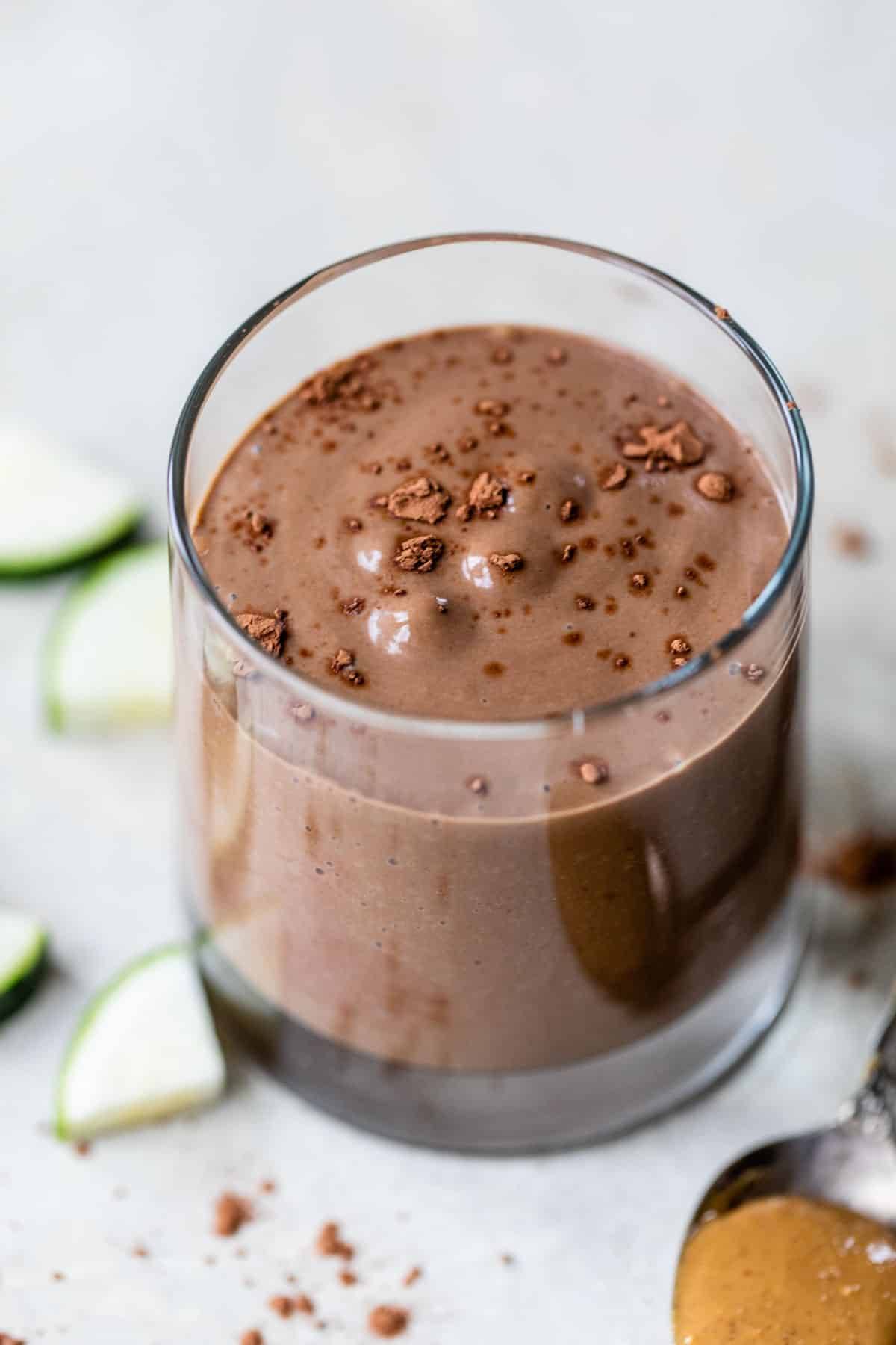 This 6-ingredient Chocolate Zucchini Smoothie is jam-packed with vegetables, but tastes like dessert! It's ultra-indulgent and creamy with rich, chocolatey flavors. You won't even notice that it's good for you!