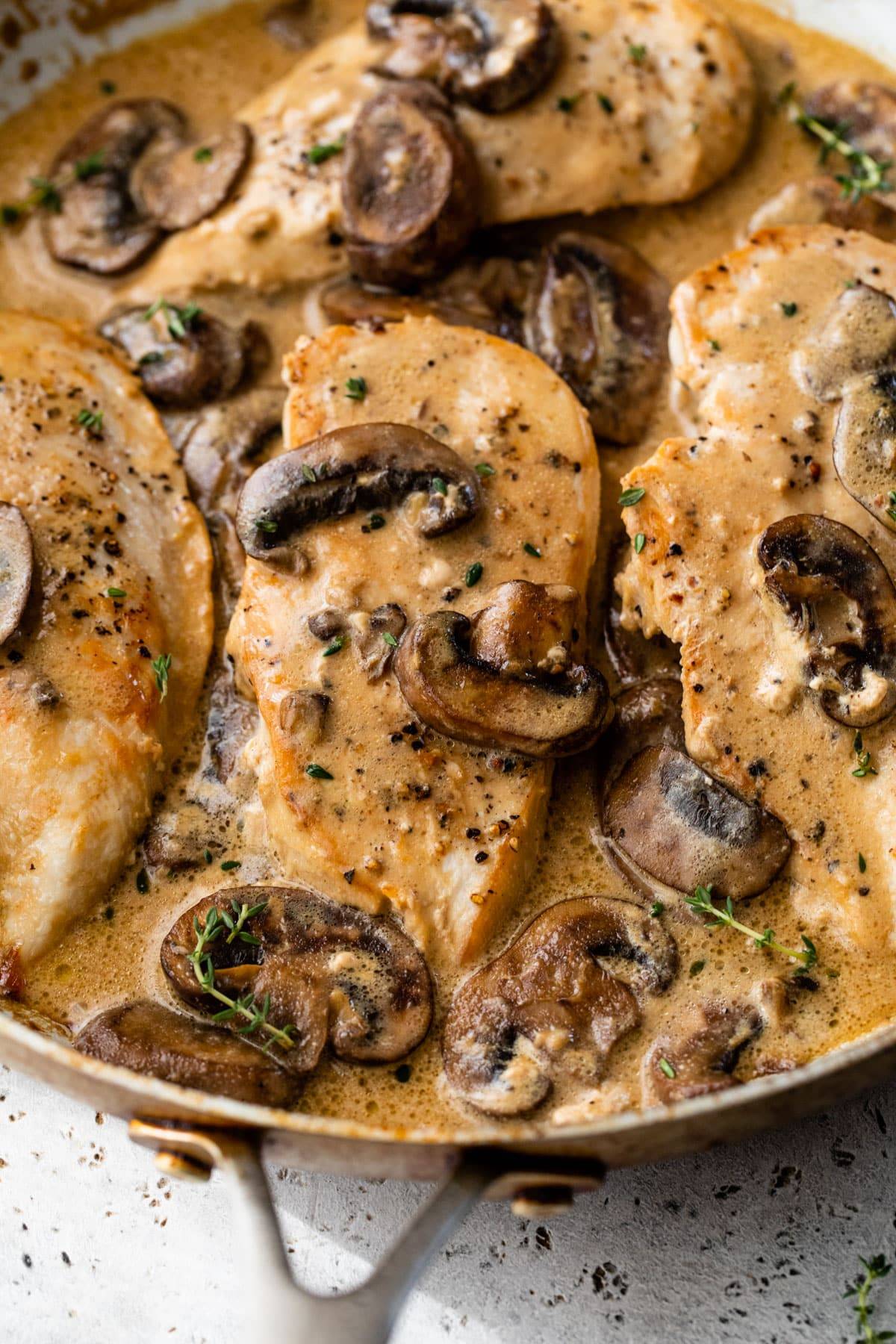 This Mushroom Chicken recipe is made with chicken breasts and a creamy garlic mushroom sauce. The whole dish comes together in one skillet and in under 20 minutes, too!