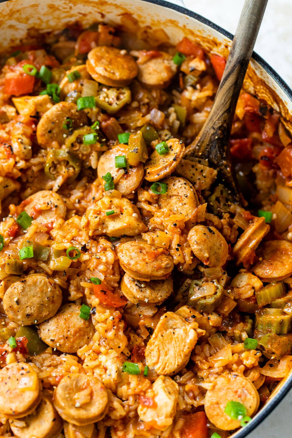 Bring soul-satisfying Cajun-style cooking to your kitchen with this Chicken and Sausage Jambalaya! Chicken, sausage, vegetables, okra, and rice get together in a rich, spicy broth in this one-skillet dinner. Perfect for Fat Tuesday or any day of the week!