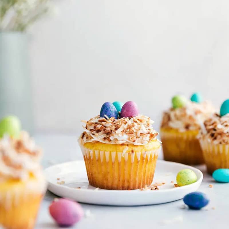 9. Easter Cupcake: Yellow easter cupcakes topped with the best cream cheese frosting, toasted coconut, and M&Ms to create the cutest (and easiest) Easter treat! These bird's nest cupcakes are so simple to make.