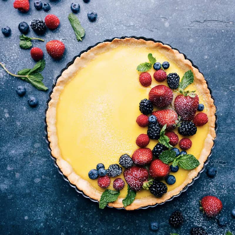 10. Lemon Tart: This Lemon Tart starts with a thick, sweet, and buttery crust which we load with a creamy, custardy tart lemon filling. Top your tart with fresh berries and a sprinkle of powdered sugar for the perfect finishing touch!