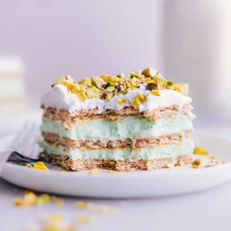 12. Pistachio Icebox Cake: Make this irresistible Pistachio Icebox Cake with layers of graham crackers and fluffy pistachio pudding, and top it with whipped cream and crunchy pistachios. This creates a perfect balance of sweet and nutty flavors with a creamy and smooth texture.