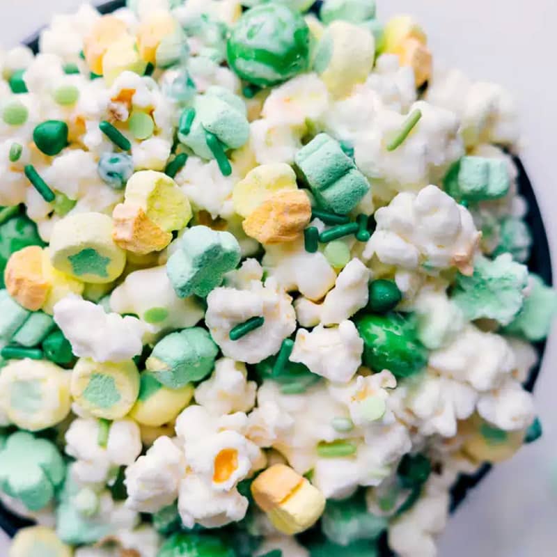 17. St. Patrick's Day Popcorn: This delicious and easy-to-make St. Patrick's Day Popcorn recipe makes a fun and festive treat! We've got a mix of M&M's, Lucky Charms marshmallows, sprinkles, and popcorn all coated in white chocolate.