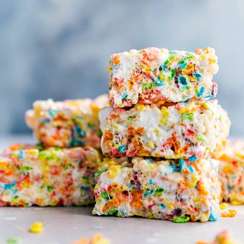 8. Fruity Pebble Rice Krispie Treats: Colorful, sweet, and easy-to-make Fruity Pebbles Rice Krispies Treats will be a hit wherever you serve them! These treats take minutes to assemble, are easy to transport, and require only six ingredients.