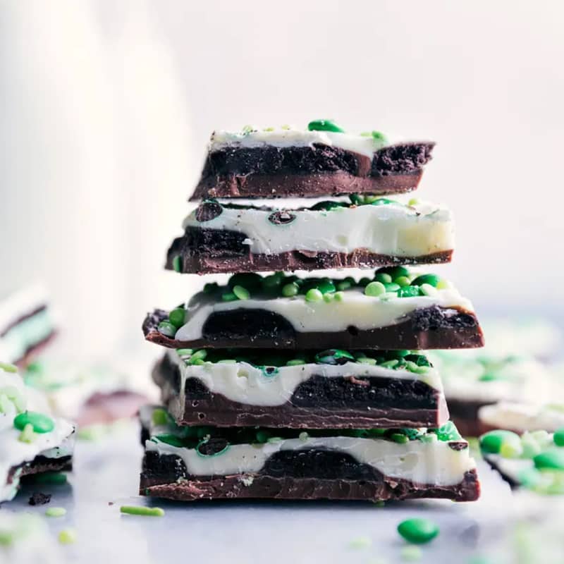 3. Mint Chocolate Bark: Only three essential ingredients in this Mint Chocolate Bark! The deliciousness starts with a milk chocolate base and is topped with Mint Oreo® cookies or Grasshopper® cookies, and then covered in white chocolate. Add some festive sprinkles and miniature M&Ms® if desired.