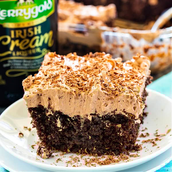Irish Cream Poke Cake is a delicously moist poke cake soaked with Irish Cream and topped with an Irish Cream-flavored chocolate whipped cream.