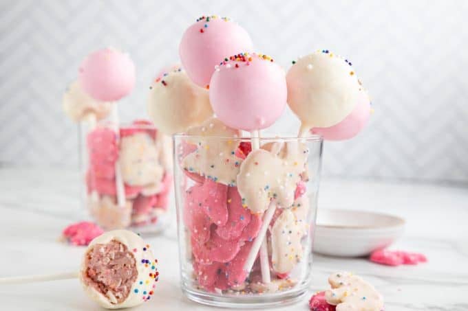 | Hello ooseims, These Circus Animal Cookie Pops will make you feel like a kid again! Transform the classic pink and white sugar cookies into easy no-bake truffle balls using simple ingredients for a sweet sprinkle-coated treat. I love that these are even easier to make than cake pops. There's no baking required in this easy dessert recipe. It takes just 31 minutes from start to finish. What could be better? Oh yeah. . . .they're PINK!