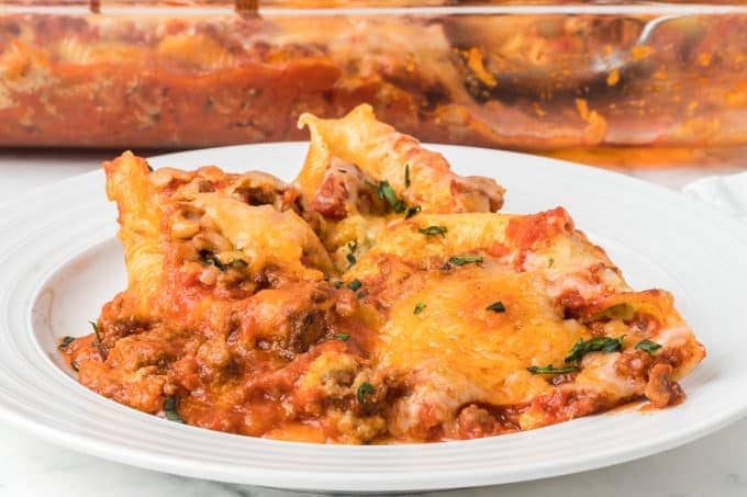 | Hello ooseims, Make these Easy Stuffed Shells with Cottage Cheese for dinner tonight! Jumbo pasta shells are stuffed with a creamy cottage cheese mixture, topped with a savory ground beef pasta sauce, then topped with plenty of gooey melted mozzarella! This easy weeknight dinner is the perfect addition to your menu! This classic recipe is delicious with any jarred marinara sauce from the grocery store. But if you have a little more time and want the absolute best stuffed shells, try making my hearty Meat Sauce recipe to use in this dish!