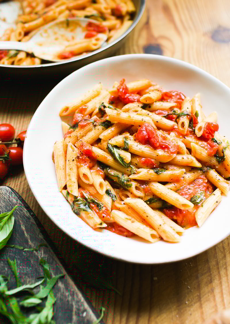 Hello Friends! Greetings from easy, weeknight dinner land! In today's post, I'll teach you how to make my delicious penne pasta with sweet cherry tomatoes and fresh basil. Whether you serve it as is (or top with sautéed chicken or shrimp) dinner is done in less than 30 minutes. So simple. So good. {Click here for the step-by-step recipe} x Emilie
